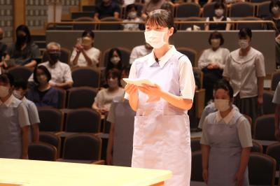 今年度の2年生は7月31日から本格的な介護実習が始まります。それに向け、生徒は多くの人から応援のお言葉もいただきました。健康福祉科3年生からは自分たちの実習での経験が語られ、「周りの人たちの優しさに気付き、感謝の気持ちで学んで欲しい」と励ましの言葉が述べられました。