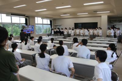 それに対して、健康福祉科2年生が1年生の実習での経験を振り返るとともに、感謝の気持ちを忘れずに実習に臨みたいと決意を示すとともに、実習生全員で実習での健闘を誓いました。