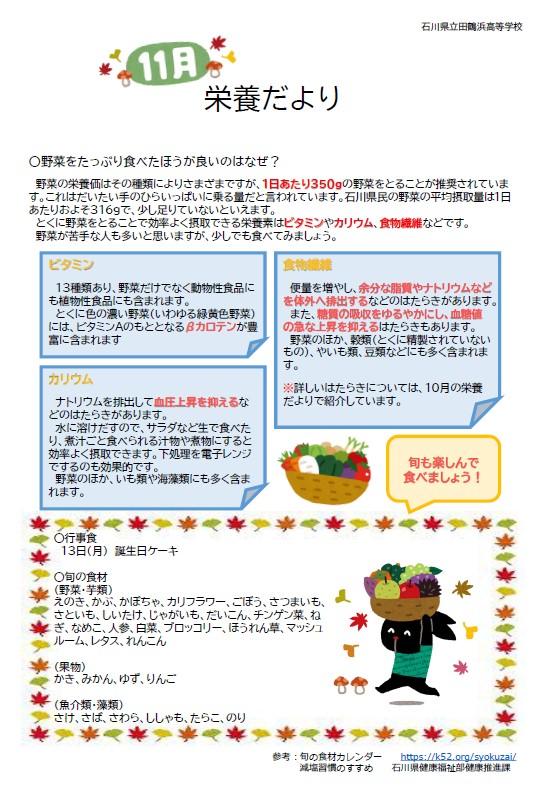 11月献立表・栄養だより 2023年10月24日 10時43分 [taturh] 11月の献立表と栄養だよりです。ご覧ください。R05_11月献立表.pdfR05_11月栄養だより.pdf(下記の画像と同様のものです)