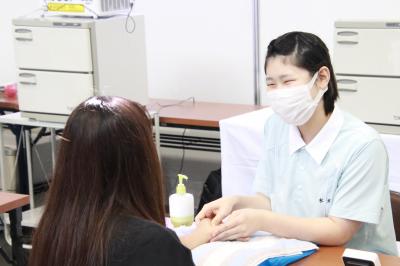 健康福祉科2年生は会場でハンドケアを実施、手話部はメインステージで手話パフォーマンスを披露しました。来場者に田鶴浜高校について知っていただくとともに、催し物を楽しんでいただくことができました。