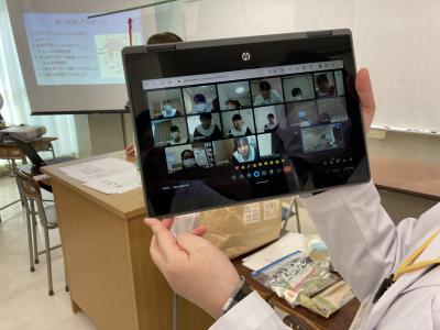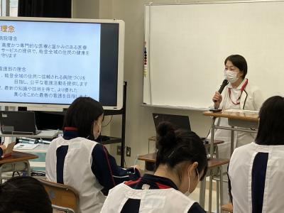 目的は、地域における病院の役割と機能、病院で働く多職種の役割と看護における連携、看護の専門性について学習することです。一部の被災生徒は、参加できませんでしたが、オンラインでつなげての実習です。対面している生徒とともに質問や感想、指導者さんとの意見交換を行い、充実した実習になりました。