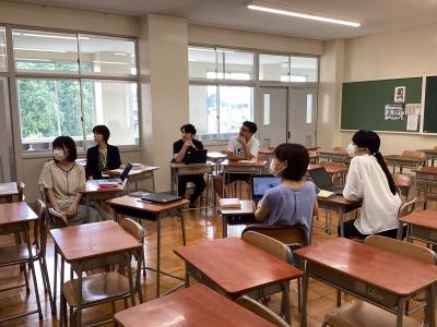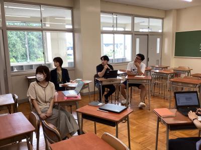 今回は、「衣食住」など生活に密着したテーマを8つ設定し、各グループが考えたプレゼン内容を若手教員間で共有し、意見交換会を行いました。生徒は、各テーマについて仮説を立て、それを検証するための実験をした結果について考察しており、本当によく考えながらプロジェクトに取り組んでいると驚かされるばかりでした。