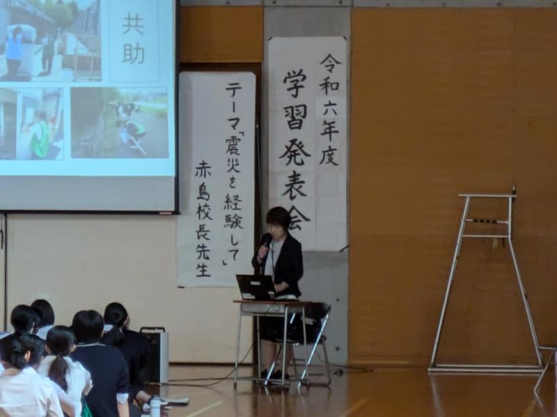看護教育棟で避難訓練後、能登総合病院の体育館で学習発表会と体育祭を行いました。学習発表会では、「震災を経験して」というテーマで赤島校長による講演と専攻科2年生による保健所実習の課題の発表を行いました。各グループのテーマに合わせた発表や、改めて震災を振り返る機会となりました。また、体育祭では、各団が団結して楽しむことができました。