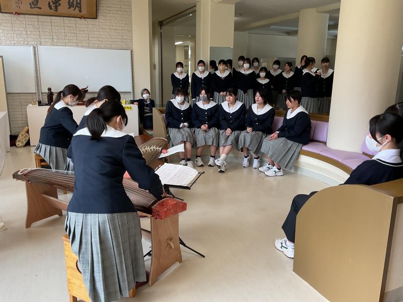 4月16日(水)昼休みに新入生歓迎の演奏会を開きました。演奏会は新入生だけでなく2・3年生も参加し、多くの生徒が筝曲部の演奏に聞き入っていました。1年生は琴の生演奏を興味津々で聞いており、和やかな昼休みとなりました。
