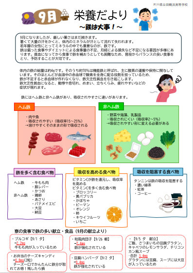 9月栄養だより・寄宿舎献立表