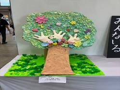 『繋ぐ友情 永遠に』は大きな木に手話で「永遠」と「アイ・ラブ・ユー」を表し、色とりどりの葉、花、草でたくさんの個性が集まるから、豊かな木になり美しい風景なる様子を表しました。