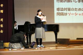 今年度は感染症対策のために多くの行事が中止や縮小されたために、1年生は入学してから『校歌』を歌う機会がほとんどありませんでした。そこで、生徒会執行部が企画して1年生の『校歌練習会』が行われました。準備としてしばらく前からお昼の放送で「校歌」を流しました。当日は、感染症対策に十分に配慮しつつ、昨年度の行事での「校歌斉唱」の様子をビデオで流した後に、クラスごとに会場を分けて練習を行いました。もうすぐ新入生も入学してくる時期が近づいてきました。コロナ感染症が収束し、みんなで安心して「校歌」が歌えることを願いながら、しっかりと練習をすることができました。