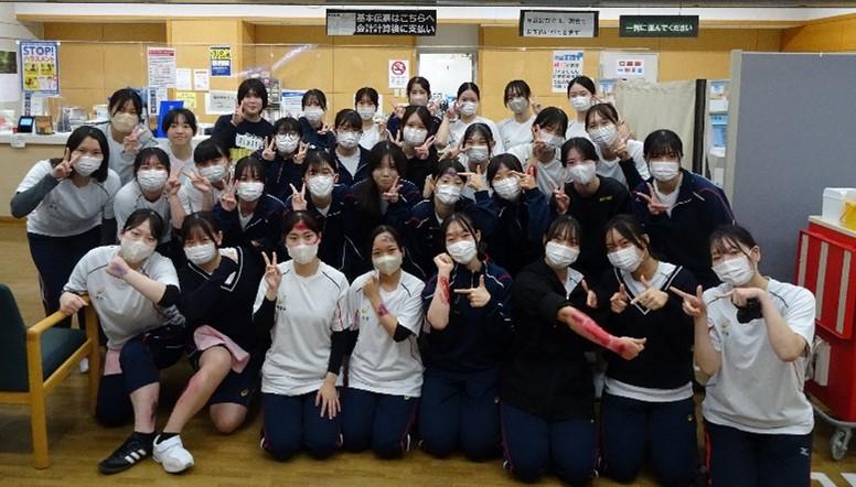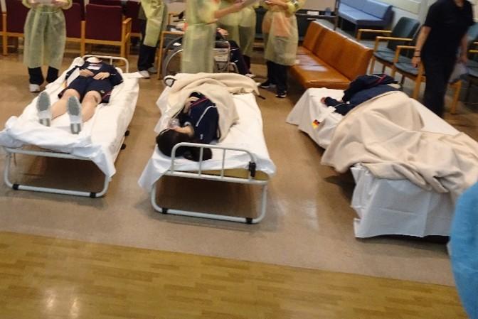 訓練では、多数の傷病者を受け入れる想定のもと、生徒たちは看護師から傷病者を想定した特殊メイクを施され、緊迫した場面での医療現場を体験しました。医師、看護師をはじめ医療スタッフが協力しながらトリアージが行われ、検査・治療へとつなげる一連の流れが実践されました。生徒はその様子を間近で体験し、災害現場での医療の重要性と、状況や症状応じて優先順位を考え、冷静に判断する力、チームで連携する大切さを学びました。災害時に看護師としてどのように行動するかを具体的に考える貴重な学びとなりました。