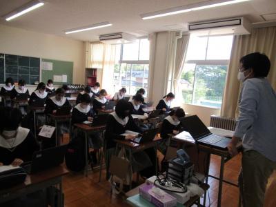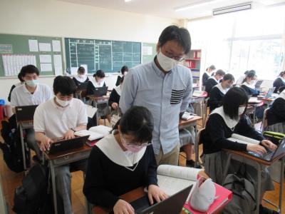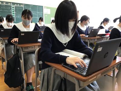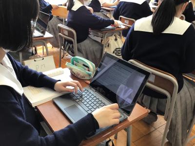 本校でもGIGAスクール構想により導入されたクロームブック使用が始まっています。授業中にも使用して、課題の提出や、確認テストなどで活用しています。利点である集計の早さを利用し、一人一人の理解度を確認し、タイムリーな補足指導を行っています。生徒たちの”新しいもの”に対応する能力がとても高く、スムーズに導入できています。対面で授業ができる良さと、ICTの利点を融合して、質の高い学びを確保していきたいと思います。