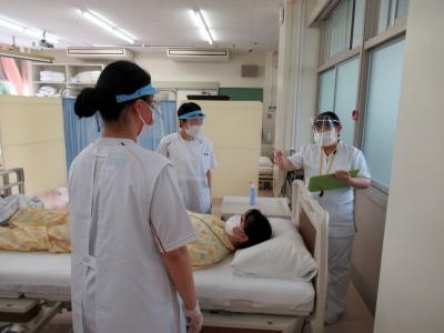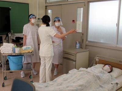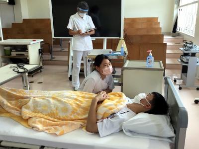 試験後には試験官を務めた教員と共に、今回の試験で気になった点について、3つのテーマごとに振り返りの学習を行い、より良い援助方法について再考し、デモンストレーションをしながら確認しました。