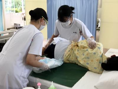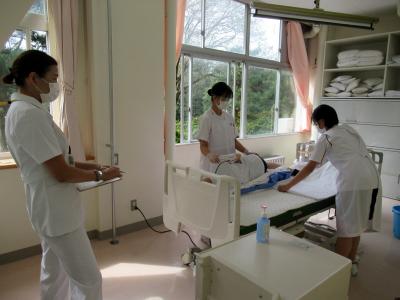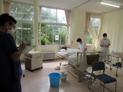 9月28日衛生看護科21Hの生徒40名は、来月8日の戴帽式を前に実技試験に臨みました。戴帽式後には、初めての本格的な病院での実習があり、それに備えて実施しました。実技は①バイタルサイン測定、②シーツ・包布交換、③オムツ・寝衣交換の3つのテーマに分かれて受験しました。それぞれ、患者や環境に条件設定があり、その場で試験官から伝えられた実技について、自分たちでその場で考えて対応するという内容でした。患者役は生徒たちが交代で演じました。麻痺や腹痛などの症状のある患者や、ベッドのストッパーが外れていたり、シーツが汚れていたりなど、様々な状況設定について、自分たちの学んできた知識と技術を駆使して対応していました。