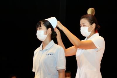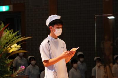 10月8日(金)に衛生看護科2年の戴帽式を行いました。式はコロナ禍の感染予防対策として、本校生徒・職員のみの参加としました。戴帽式は本格的な病院での臨地実習を前にその決意を固める大切な行事です。3年の代表生徒による「励ましの言葉」はとてもやさしく、戴帽生をあたたかく包み込むような言葉でした。また戴帽生代表の「誓いの言葉」はとても頼もしく感じられました。聖火を灯し、ナイチンゲール誓詞を唱える場面は厳粛で感動的でした。