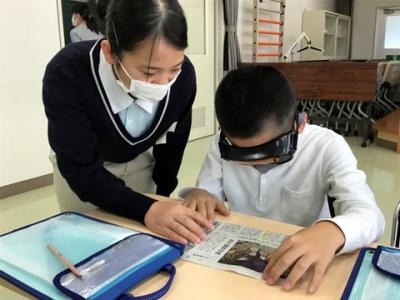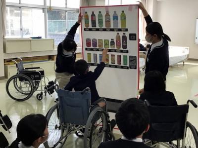 2021年11月26日(金) 田鶴浜小学校4年生33名の児童が本校を訪れて高齢者体験と車いすの体験をしました。7月はZoomによる交流でしたが、そのときに交流した児童と今回は直接ふれあうことができました。
