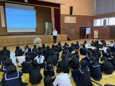 硬筆書写コンクールに入賞した児童の表彰の後、生徒指導の先生からは、春休みにお世話になってはいけない「音」のクイズを出しながら、春休みの生活についてのお話がありました。