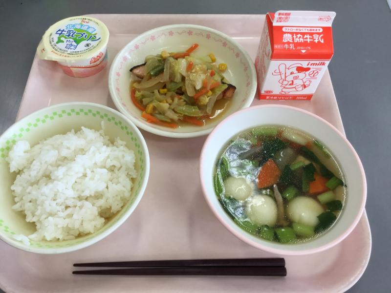 そこで、今日の給食には、北海道が生産量日本一を誇る、「馬鈴薯」と「生乳」を取り入れた、「鮭のちゃんちゃん焼き、いもだんご汁、ミルクプリン」にしてみました。