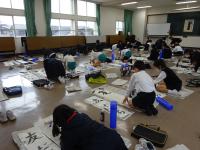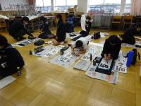 始業式の後に、書き初め大会がありました。冬休みの練習の成果を出そうと、みんな、真剣にとりくんでいました。書き終えた字も、みんな力作ぞろいでした。