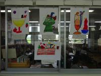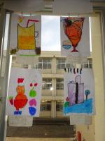 毎日暑くムシムシする日が続いています。廊下や掲示板に、2年生が図工の時間に絵具を水で薄める学習で描いた「オリジナルジュース」が飾られています。