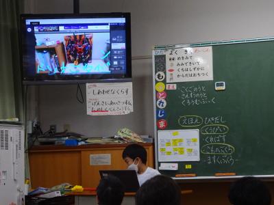 この日は、国語科「好きなもの なあに」の学習で、自宅で撮影してきた自分の好きなものを画面に映しながら、「ぼくの好きなものは、〇〇です。どうしてかというと、・・・だからです。」と、しっかりした声で発表していました。