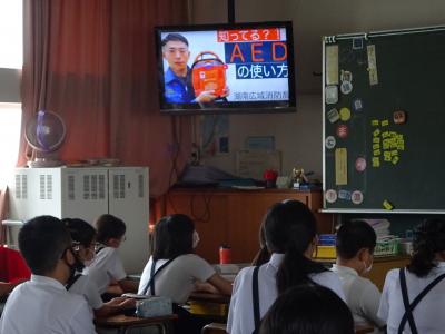 9月2日のはくれいタイムに全校児童がテレビ放送で、AEDの役割や使い方、学校のどこにAEDがあるのかについて学びました。