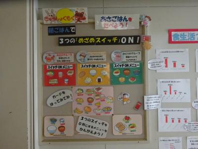放送室前掲示板に、栄養教諭が、子ども達が楽しく朝ごはんの大切さを学べるよう工夫して掲示しました。また、給食だよりでも、「20分朝ごはん」を紹介し、みなさんから「我が家の簡単あさごはん」レシピを募集しています。