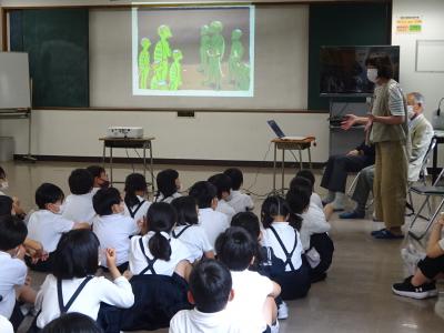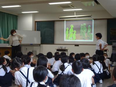 「かっぱ合戦」の紙芝居は、昔の小学3年生が考えたお話だと知って、「えー、すごい!」と驚くとともに、これからの民話の学習に意欲を高めた様子でした。