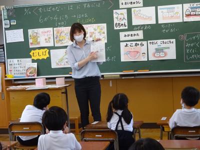また、全クラスが学活の時間に歯に関する学習を行いました。1・2年生は養護教諭と一緒に歯の磨き方について、3年生はおやつの取り方、4年生は、かむことについて、5年生は歯の汚れについて、6年生は、歯周病についてそれぞれ学習をおこないました。どのクラスも、学習後には学んだことを生かして家での歯磨きカードに取り組みます。