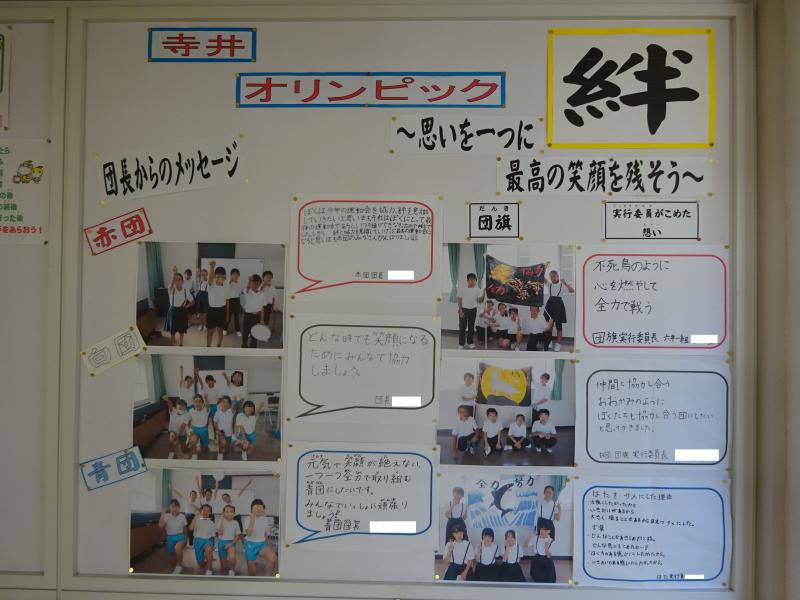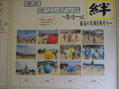 10月9日(土)、好天の秋空のもと、寺井オリンピックを行いました。職員室前掲示板に各学年の競技や演技の様子を掲示しました。寺井オリンピックが終わった午後に先生方が協力して掲示したものです。子ども達が最後まであきらめずに全力で取り組む姿に、教職員もたくさんの感動をもらいました。そして、全力を出し切り達成感に満ちた子ども達の「最高の笑顔」をたくさん見ることができました。各学年1種目だったことが、練習への集中力と思いを高めることにつながりました。また、全校児童が一堂に会して行ったことで、学校全体の一体感が生まれ、高学年の素晴らしい演技が下学年の児童の心に感動を与え、「自分もあんな高学年になりたい」という、憧れの思いにつながりました。