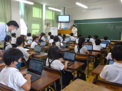 2年生が、ICTインストラクターの先生とクロームブックでローマ字入力の第一段階としてのホームポジションの練習をしていました。キーボードの「J」と「F」に人差し指をのせ、「J.F. J.F」など、学習アプリの課題の通りに入力すると「クリアー!」と表示がでて、「やったー」「できたー」と歓声を上げながら楽しく学習していました。ローマ字学習は3年生から始まりますが、少しずつ無理なく楽しくICTスキルの積み上げを進めています。