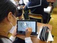 紙やタブレットに、マンガやイラストを楽しみながら描いています。描いたものをクロムブックで共有し、お互いにコメントを送ることで多学年の交流が広がったり、意欲が高まったりしています。