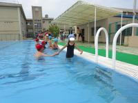 1年生と6年生が「なかよしプール」を行いました。6年生が1年生をおんぶしたり手を引いたりして、1年生を大プールに入れてあげました。また、小プールに一緒に入って宝探しゲームなどをして、楽しくなかよく触れ合いました。しゃがみこんだり、体をかがめたりして1年生の顔を覗き込んで声をかける6年生の姿は、優しさと思いやりにあふれていました。1年生は、6年生の優しさが思いが伝わり、終始笑顔でとっても楽しそうでした。
