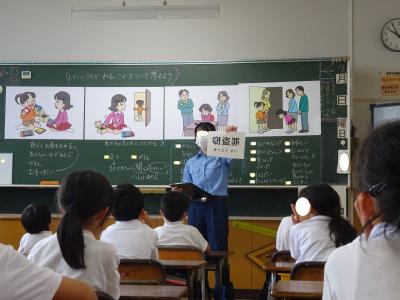 2年生が警察の方からお話を聞き、社会のルールやきまり、約束について考えました。今回は「人のものをとる」ことについてでした。