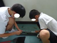 使い方を教わると、さっそくグループの仲間と協力しながら、慎重に、そして真剣に伝統の技に挑戦していました。