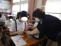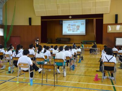 5年生が、総合的な学習の時間に福祉について学びました。講師は、前回と同じく、金沢医科大学 非常勤講師の別宗 利哉さんです。その他に、視覚障害の方、統合失調症の方、車椅子の方にお越しいただきました。