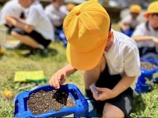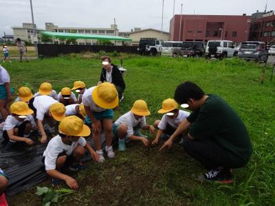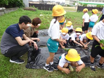 1年生がサツマイモの苗を畑に植えました。