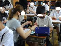 使い方を教わると、さっそくグループの仲間と協力しながら、慎重に、そして真剣に伝統の技に挑戦していました。