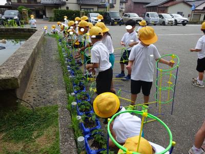 1年生が、生活科の学習で5月18日に植えた朝顔の種が、芽を出し、葉が茂りツルが伸びてきました。