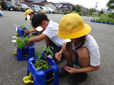 前日に雨が降った日には、「先生、今日、水やりする?」と悩みます。「どう思う?」と問い返すと、「うーん、昨日降ったし土が濡れているからやらない。」「私はやる。だって今日熱くなりそうだらか、朝顔ものどかわくと思う」など、考え自己決定して世話をしてきました。
