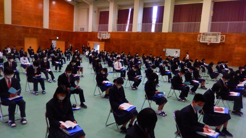 全員がマスクを着用し、間隔を2m空けての集会でしたが、学校再開に向けて各課からの説明を真剣に聞くことができました。