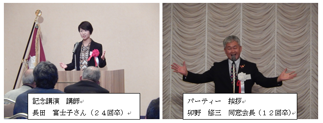 今回も、ご多忙中にかかわらず、第52回同窓会総会・パーティーにご出席頂き、ありがとうございました。今回の講師、長田富士子さん(平成元年・24回卒)の講演「山の恩恵(めぐみ)」は自然への感謝の気持ちから「狩女の会」を立ち上げ、白山麓の自然の利活用に取り組んでおられる姿を詳しくお聞きすることができ、非常に有意義な時間でした。