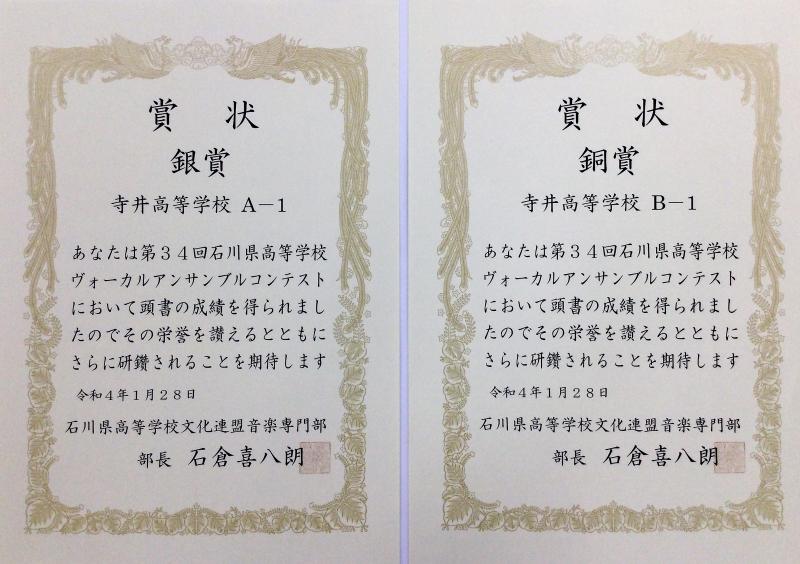 第34回石川県高等学校ヴォーカルアンサンブルコンテストにて、エントリーしたA-1が銀賞、B-1が銅賞に表彰されました。曲は『いろはにつねこさん』を歌唱しました。おめでとうございます!