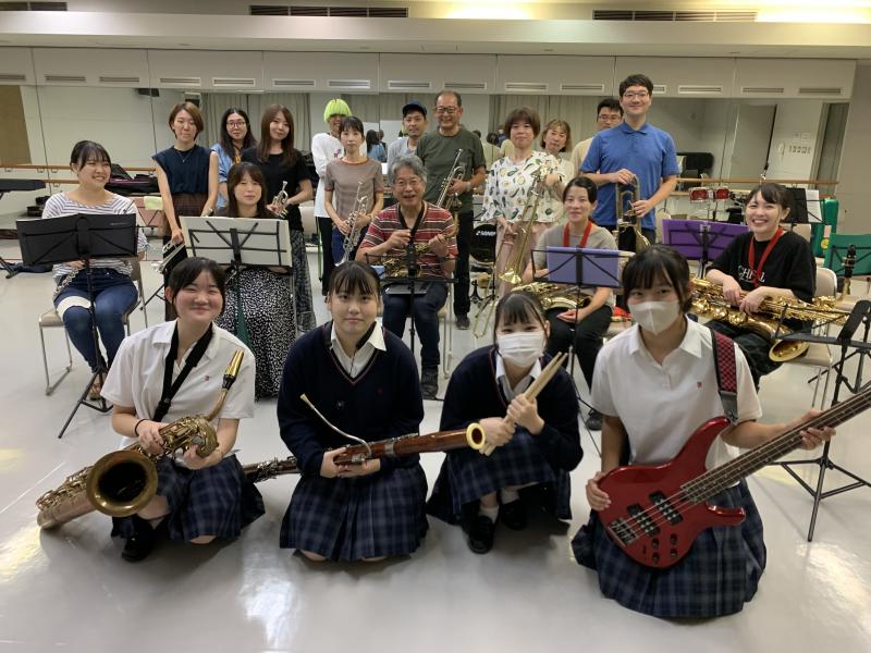 社会人バンドの方々に囲まれて笑顔の部員たち