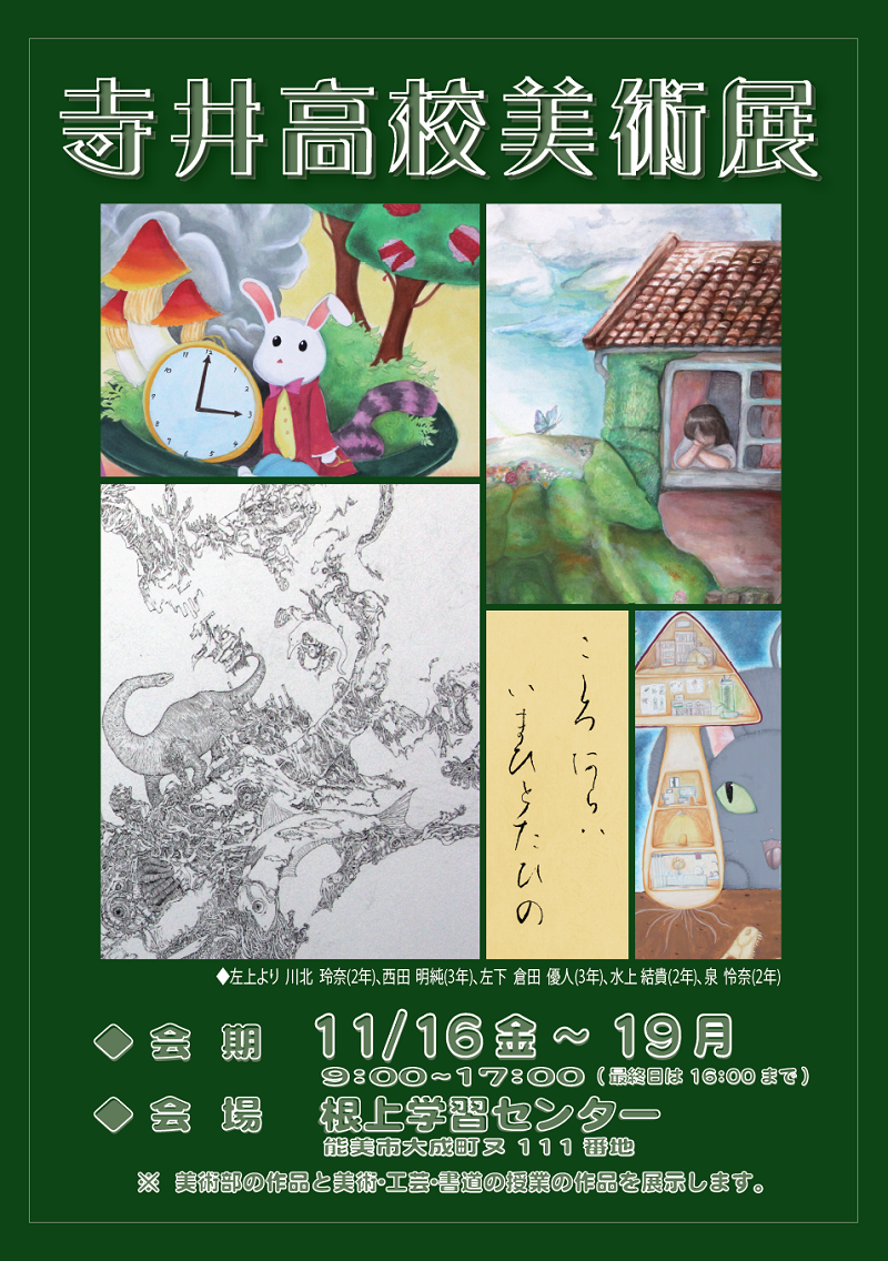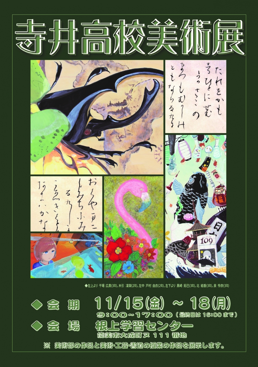 毎年開催しております「寺井高校美術展」のご案内です。この作品展では、本校の美術、工芸、書道の各授業および美術部の活動で制作した作品を展示いたします。