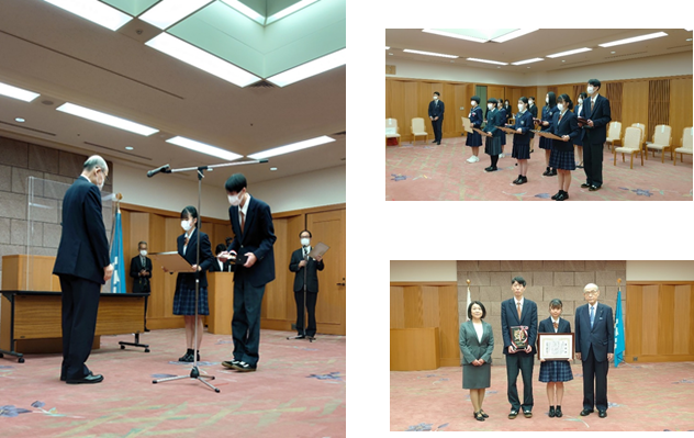 JRC部を代表して、3年生の西田七海さんと寺中颯さんが表彰式に参加しました。3年間の活動を通して次のように感想を述べています。