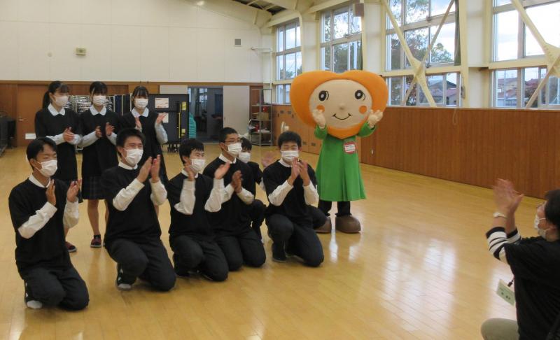能美市社会福祉協議会のマスコットキャラクター「のみんちゃん」の着ぐるみも着て、みんなで大声で笑い、合唱部の歌に合わせて「笑いの花道」を踊りました。