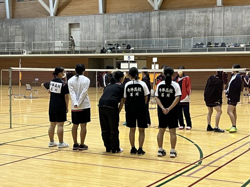 2年生中心の新チーム、デビュー戦になったのは、コロナ禍で3年振りに開催された団体戦オンリー(変則的な2複1単。5人がレギュラー)の県高校バドミントン根上大会。寺高バド部の戦績は…。男子は8シード校の金沢二水高校相手に、第2ダブルスとシングルスの両方で、本校が1ゲームを奪う善戦。負けた第1ダブルスも、二水の1番手ダブルスに第1ゲームで10点(15点3ゲーム)を取って、勝ちに行くムードを高める「いい仕事」をしました。