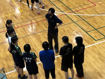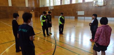 この日の部活は午前練習で、大学2年生(元主将)と専門学校2年目の男子卒業生+3年生3人が参加してくれました。顧問の2人も「大車輪」で基礎打ちやゲームに入り、充実した半日練習になりました。写真は、元主将のN君が、練習終了後、後輩達にアドバイスをしている様子です。