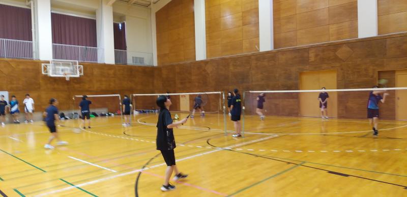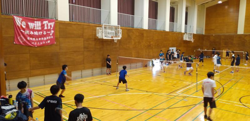 加賀地区上位校の小松高校(男子は三冠)が、男女(計32名!)で来てくれました。本校は卒業生も加えて、顧問もゲームに入り、ダブルス→シングルスの順番に熱戦を展開しました。夏休みの練習テーマ(チーム全体と個人の課題)を発見できたと思います。