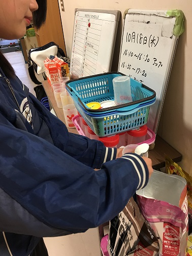 マネージャーも忙しく働いています。選手が飲むプロテインを作っています。