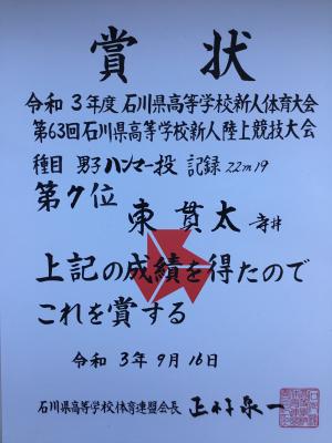 各種目5位までが北信越新人大会への切符が得ることができ、その切符獲得を目指してチーム一丸となって挑んできました。結果は、男子ハンマー投げで第7位という素晴らしい結果となりました。その他にも自己記録を更新できた生徒も多く、これまでの練習の成果だと感じます。陸上競技部の生徒たちは、自分を試す・試されるような機会において、自分を成長させる場に変えることができていました。