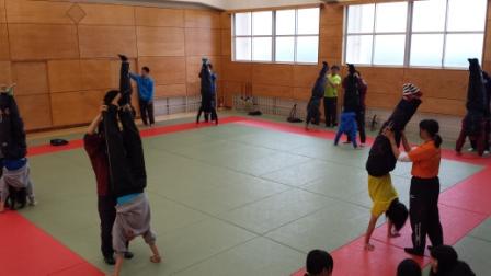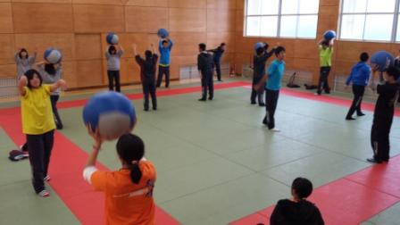 (格技場での体幹トレーニング)
